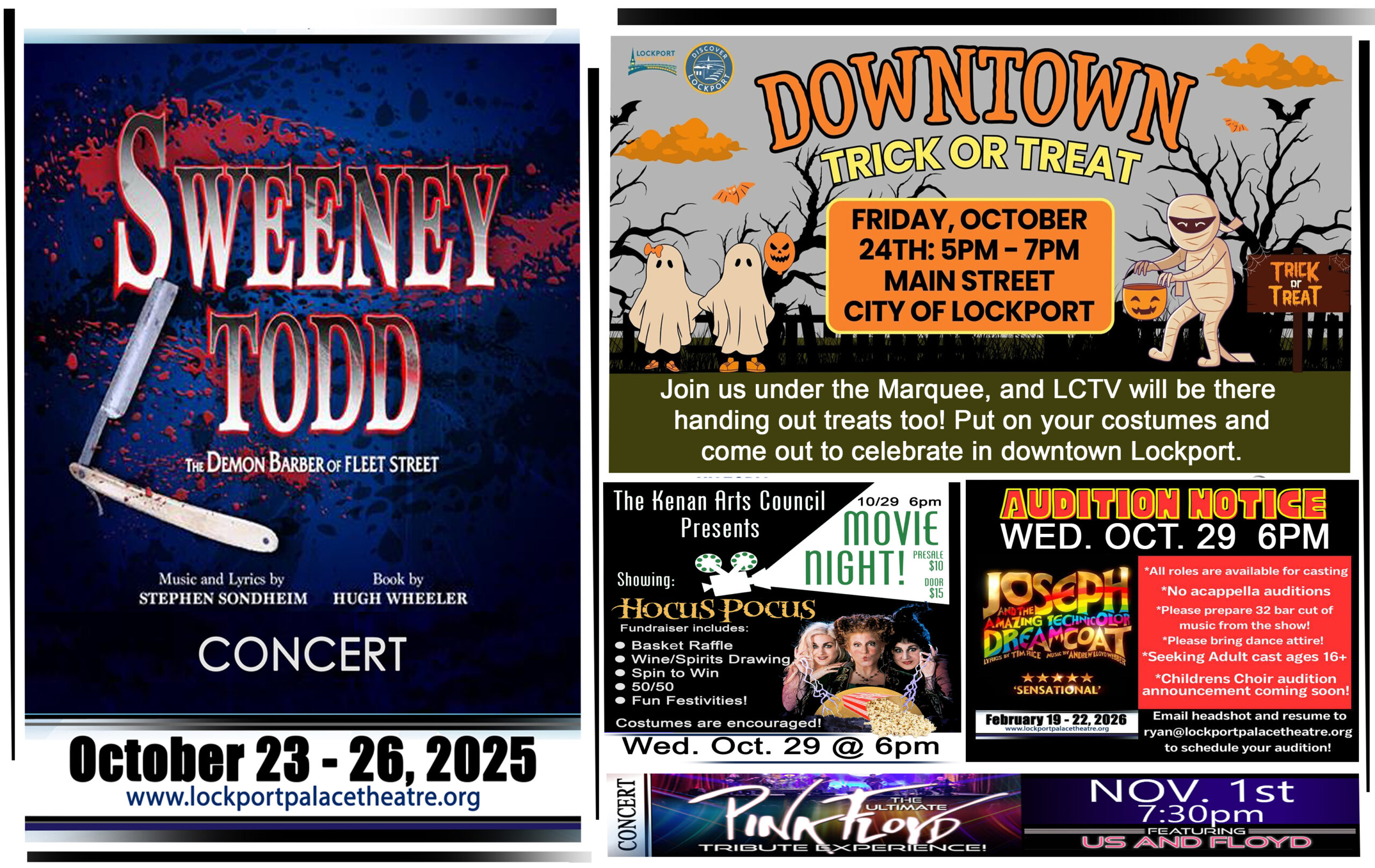 Sweeney Todd Concert 3:00 pm Sweeney Todd Concert Oct 26 @ 3:00 pm – 4:30 pm ![]() Sweeney Todd Concert October 23 – 26, 2025 Tickets, click here – Sweeney Todd Concert – ThunderTix, Box Office Ticketing Software Stephen Sondheim’s thrilling musical ... | Auditions for “Joseph and the Amazing Technicolor Dreamcoat.” 6:00 pm Auditions for “Joseph and the Amazing Technicolor Dreamcoat.” Oct 29 @ 6:00 pm – 8:00 pm ![]() We are excited to announce auditions for “Joseph and the Amazing Technicolor Dreamcoat.” We invite performers to join us on Wednesday, October 29, from 6 to ... Hocus Pocus – Movie – Kenan Center Fundraiser 6:00 pm Hocus Pocus – Movie – Kenan Center Fundraiser Oct 29 @ 6:00 pm – 9:00 pm ![]() The Kenan Arts Council presents – Hocus Pocus Wednesday, October 29, 2025, 6pm The KAC will be hosting the classic movie “Hocus Pocus” at the ... |