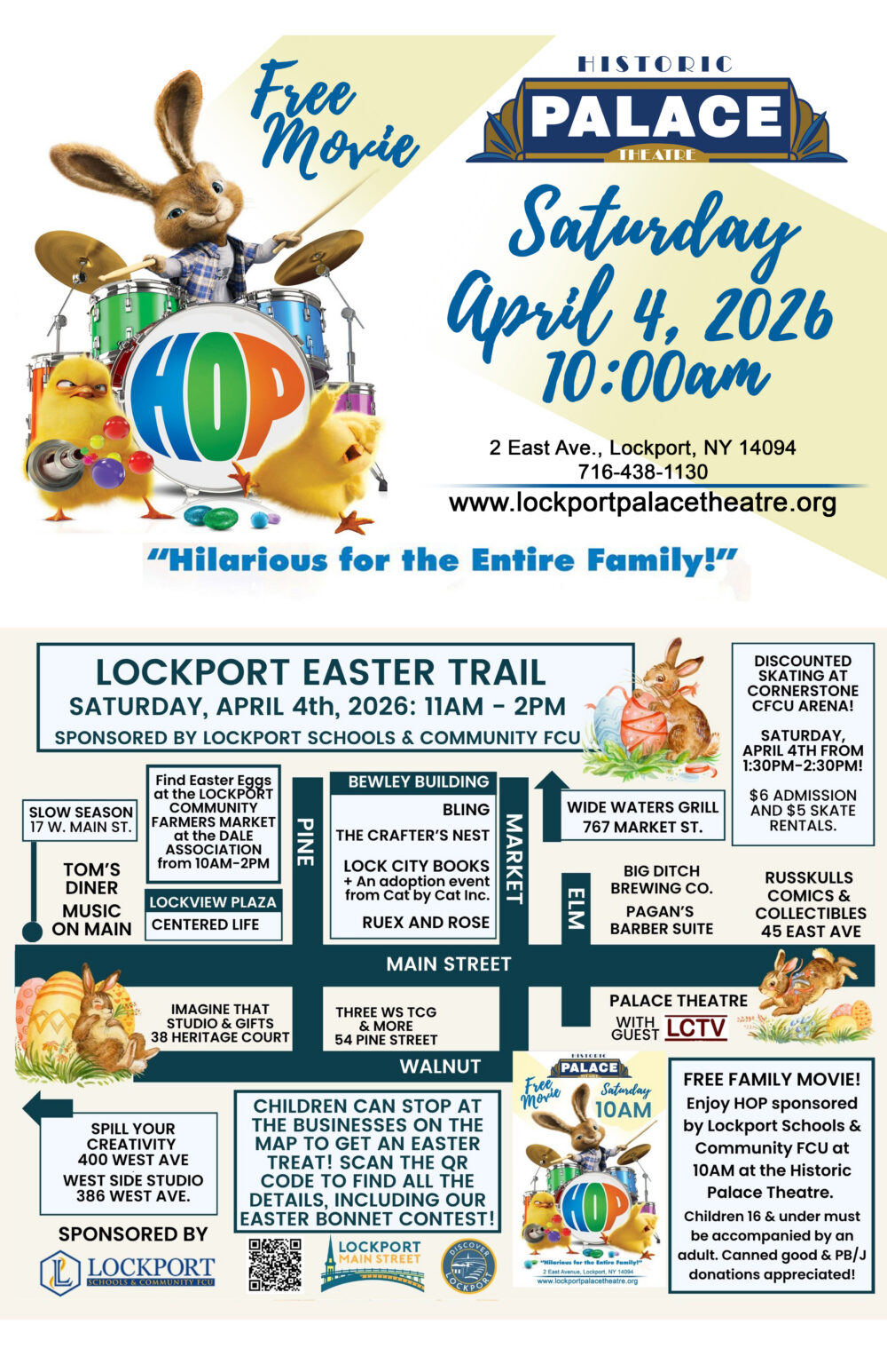 Join us on Saturday, April 4, 2026 for a fun-filled morning in the City of Lockport! Children can bring their baskets and visit participating shops for special Easter treats from 11AM-2PM, enjoy an Easter egg hunt & Bonnet contest at the Lockport Community Farmers Market from 10AM-2PM, and enjoy a free showing of Hop at 10AM at the Historic Palace Theatre Lockport